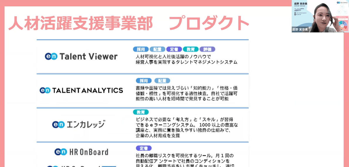 具体的には、適性検査の『Talent Analytics』や研修サービスの『エンカレッジ』、エンゲージメント可視化ツールの『HR OnBoard』といった自社サービスを複合的に提案し、企業の課題解決を支援しています。