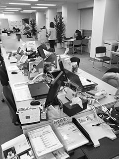 そうそう、私、写真が趣味なんですけど。コレ、偶然、18時直後に誰もいない営業アシスタントさんたちのデスクを撮影したものです。