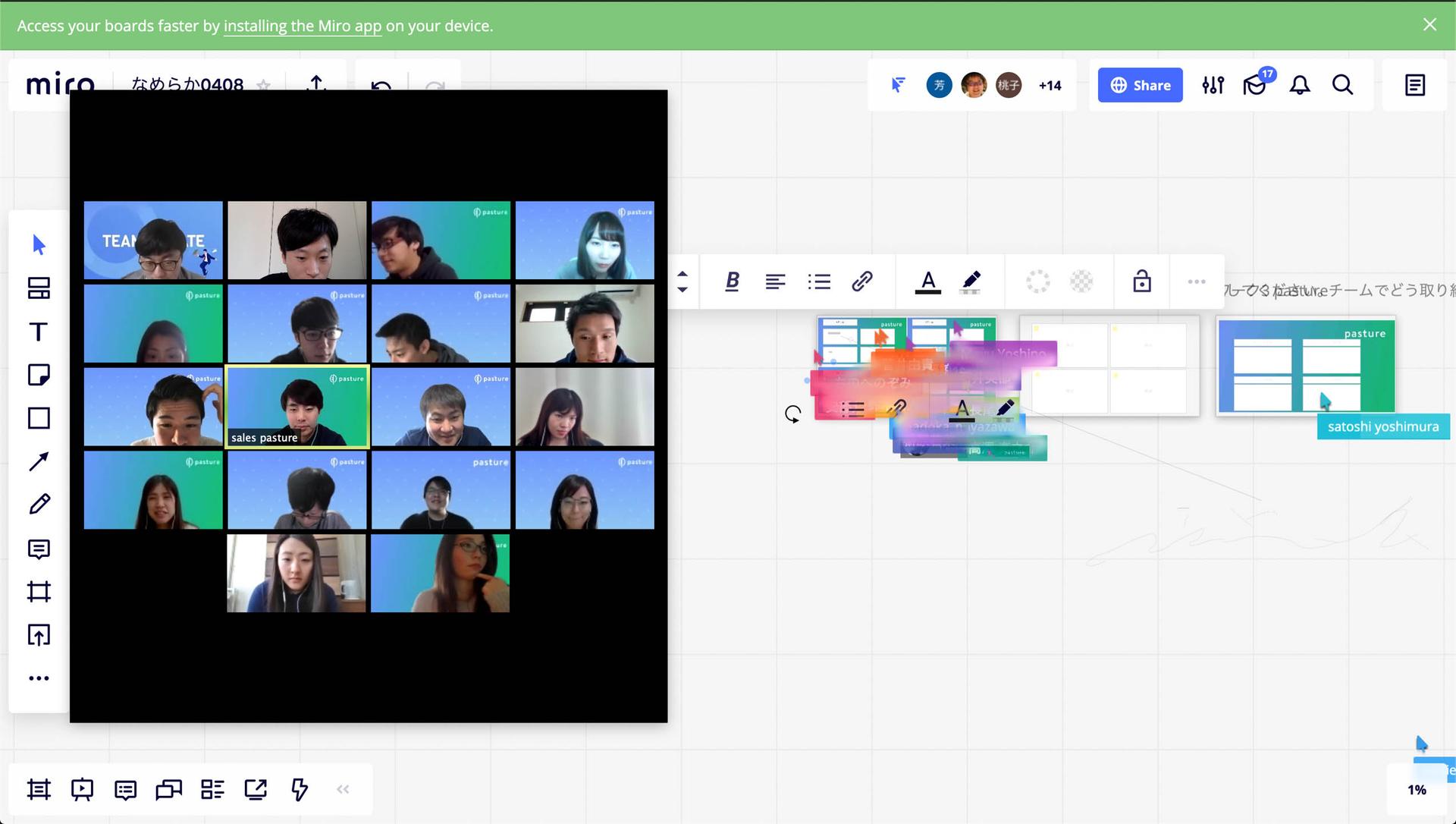 もはや当たり前になったオンラインミーティング。ミーティング前にオンラインミーティング用のURLを共有したり、ミーティング開始前にルームに入って準備をしておくなどをみんなできちんとルールを守ることがとっても重要だなと感じています。pastureチームでは定例ミーティングはいつもファシリテーターをしてくださっている橋本さんのおかげで、運営がとってもスムーズです!