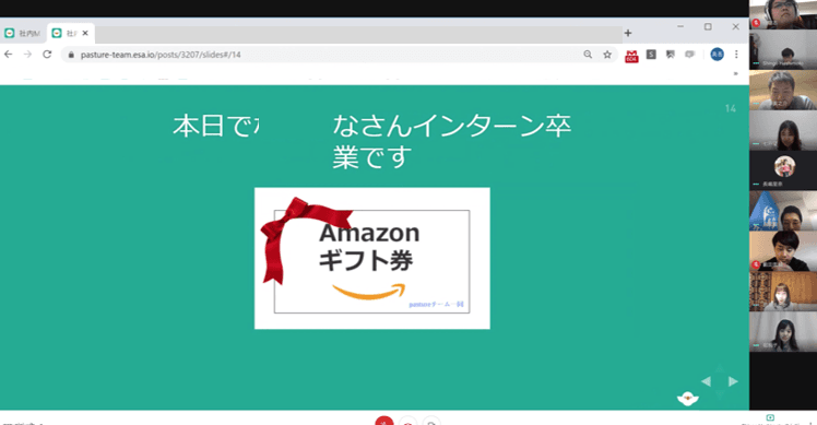 リモートワークでもみんなでランチいきたいですよね。pastureでは隔週で別チームの人とコミュニケーションをとるシャッフルランチを実施中です。またカスタマーサクセスチームではインターン生の送別ランチを実施したとのこと(もはや食べ終わってる写真笑)インターンが最終出社日にも関らず、リモート対応になってしまためオンラインでランチを実施したとのことです。