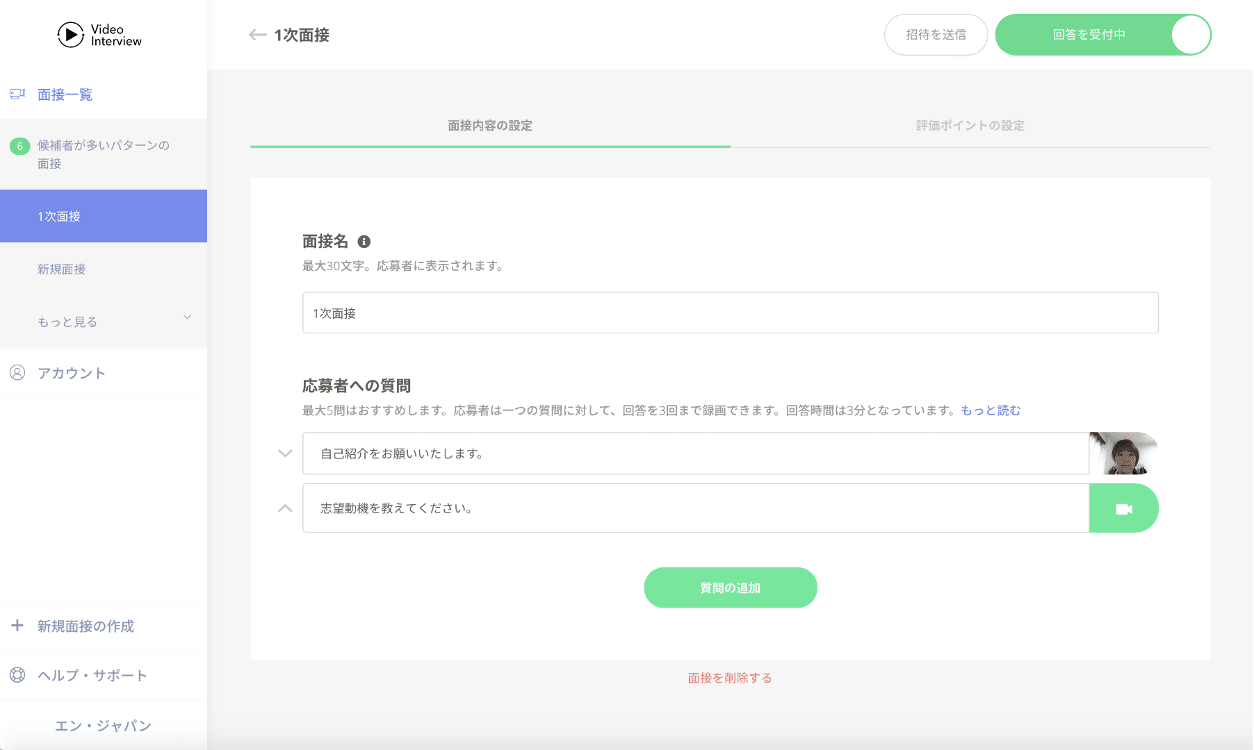 質問右側のビデオマークから、面接官の動画も添付できます。