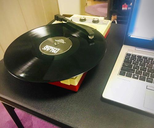 PCとレコードプレーヤーがこんなに至近距離にある仕事風景、見たことない。