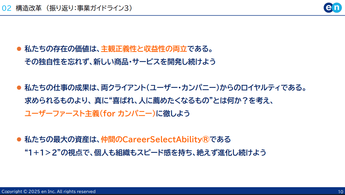 エンがいま直面している「構造改革期」を乗り越えるためには、私たちは変化を待つのではなく、"変化を起こす側"にならなければいけない。そうなった時に、仕事をするうえで何を軸にするのかが非常に重要です。