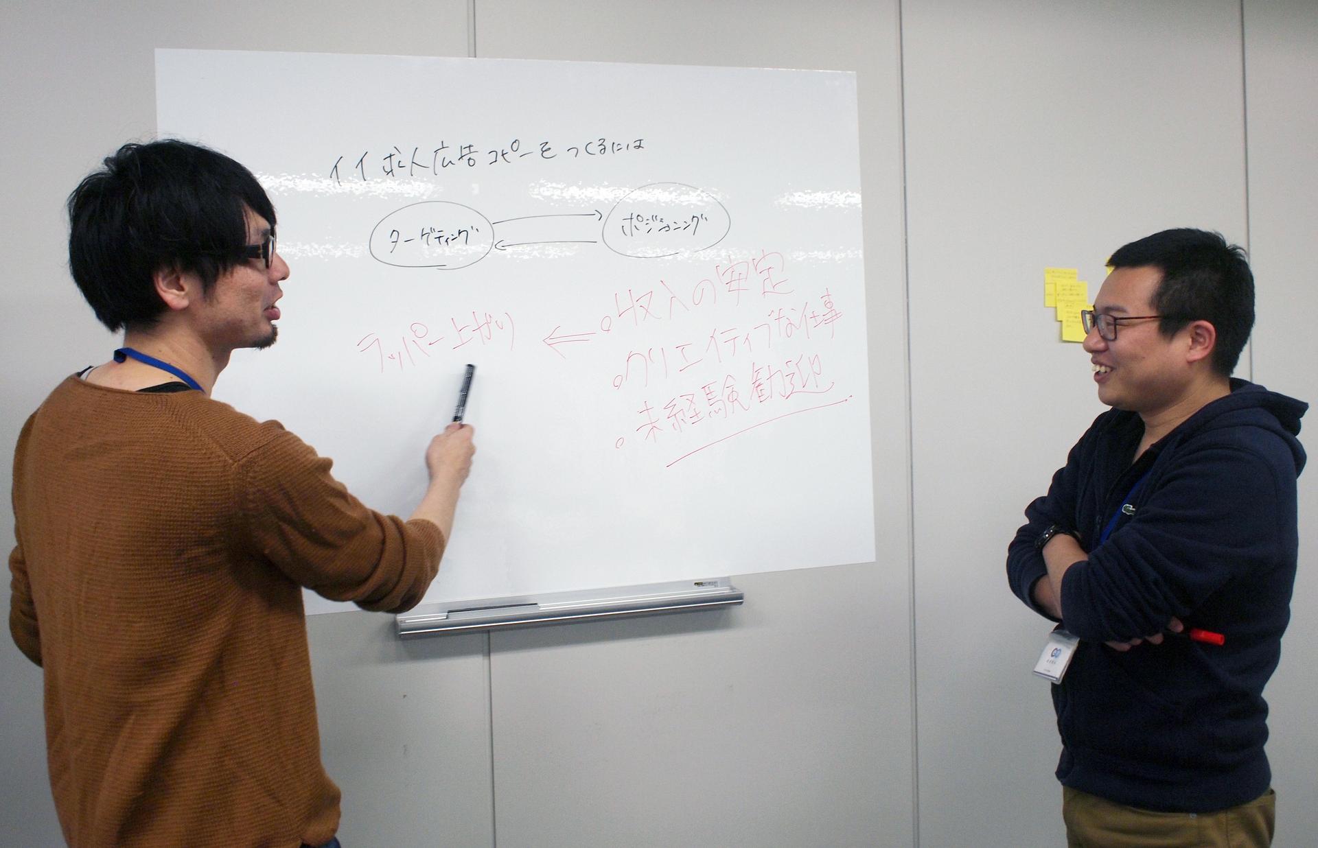 エン・ジャパンのことは知っていたので、「結構有名な会社じゃん」というのが第一印象でした。で、誘われた仕事がコピーライター。正直、僕の中で一部の特殊な人だけがやっている仕事というイメージだったので、そんなもの今から始められるのかなぁという不安はありました。