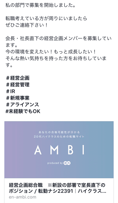 20代ハイクラスにガンガン利用してもらっていると噂の、スカウト型求人サイト「AMBI」に当社の経営企画室募集が! 上場企業の経営企画室が、未経験からOKとな! なんてレアな求人…!