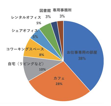 一番印象的だったのが、この結果。「お仕事専用の部屋」があり、そこで仕事をされる方が多いというもの(どういった部屋なのだろう...)。プライベートと仕事モードを切り分けていらっしゃるんですかね。その他、カフェはもちろん、コワーキングスペースやレンタルオフィスなども活用されているという結果に。