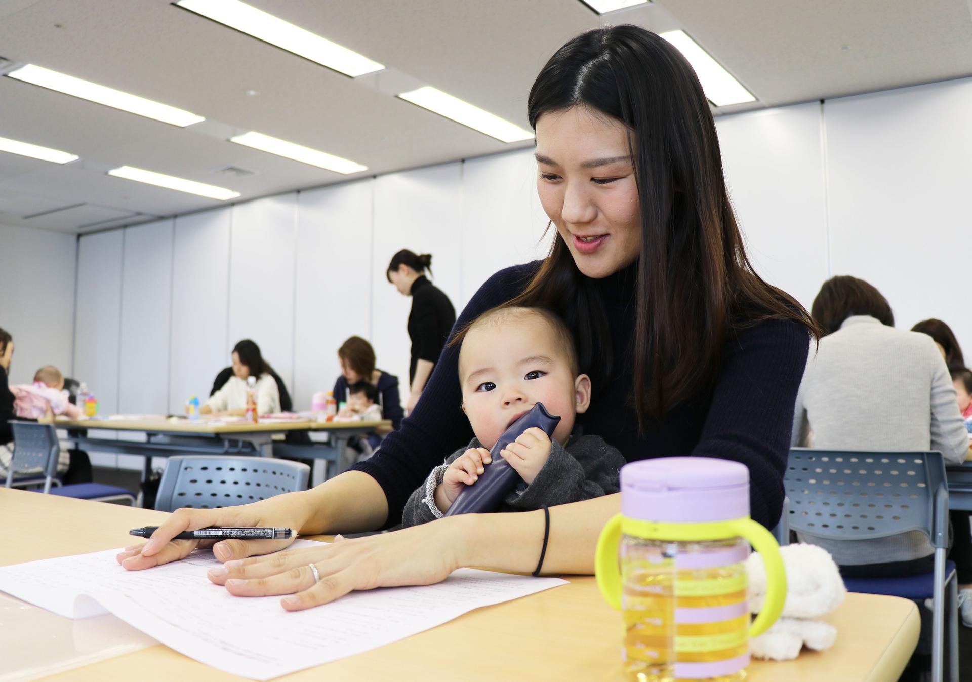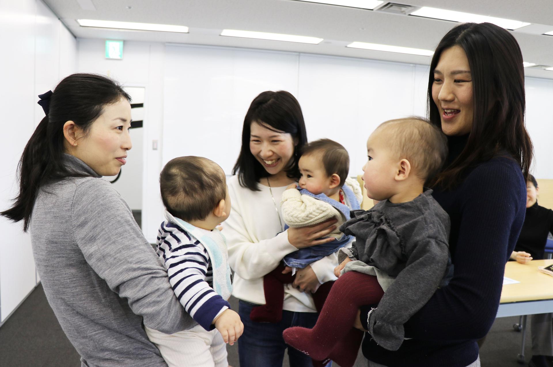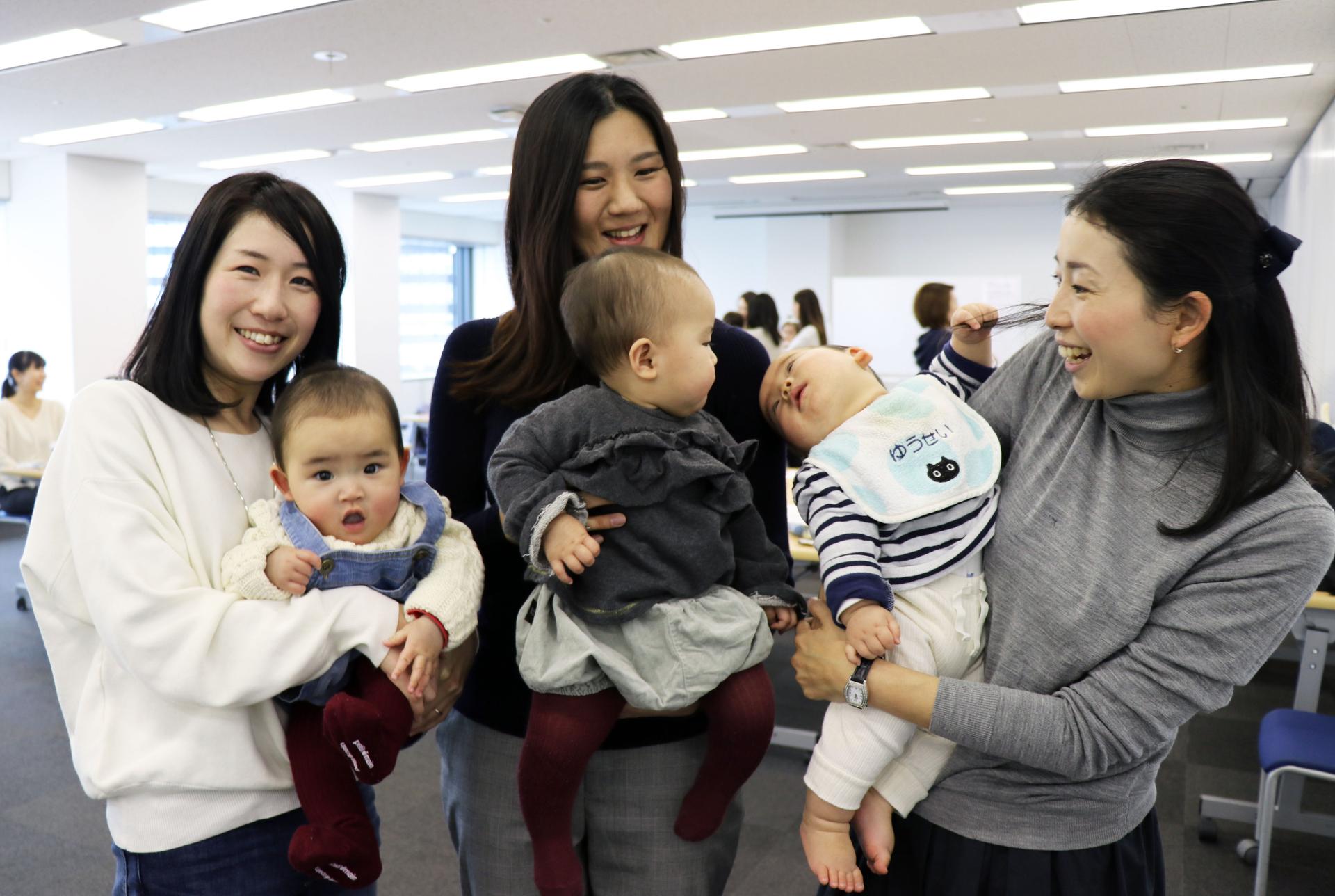 本日は当社で育児休業中の社員ふくめて、さまざまな育休中の女性が参加。「子連れ参加OKなのは1才児以下」ということもあり、月齢の近いベイビーたちがそこかしこに。
