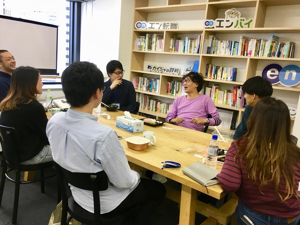 ※エンでは頻繁に役員と社員のランチ会が開催されている。会長である越智とのランチ会は「おちめし」。社長の鈴木とのランチ会は「すずめし」。役員の河合とのランチは「めぐめし」と呼ばれている。