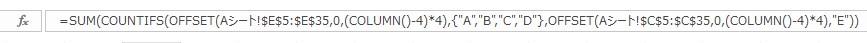 =SUM(COUNTIFS(OFFSET(Aシート!$E$5:$E$35,0,(COLUMN()-4)*4),{"A","B","C","D"},OFFSET(Aシート!$C$5:$C$35,0,(COLUMN()-4)*4),"E"))