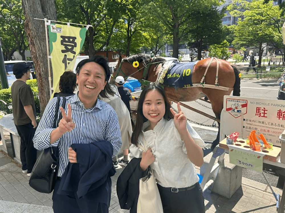 なんと、大通り沿いで馬に遭遇!岩﨑さんと一緒に記念撮影📸
