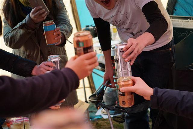 設営がおわったら、さっそく乾杯!真昼間から飲めるのも、キャンプのイイところですね。笑