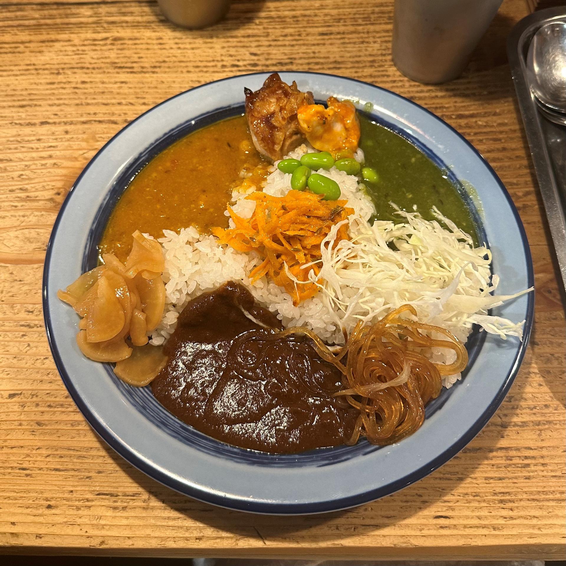 チームリーダーに教えていただいた盛り付け方がおすすめです!写真のように盛り付けると、1度に3種類のカレーを楽しむことができます!