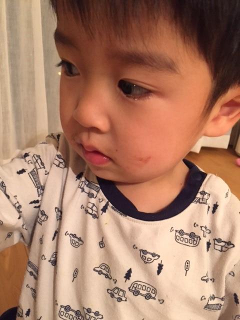 目は、「なんでボクを放ったらかしにして、起きてるの!」と涙がついている。 (母が横で寝ていないと泣くタイプ!笑)