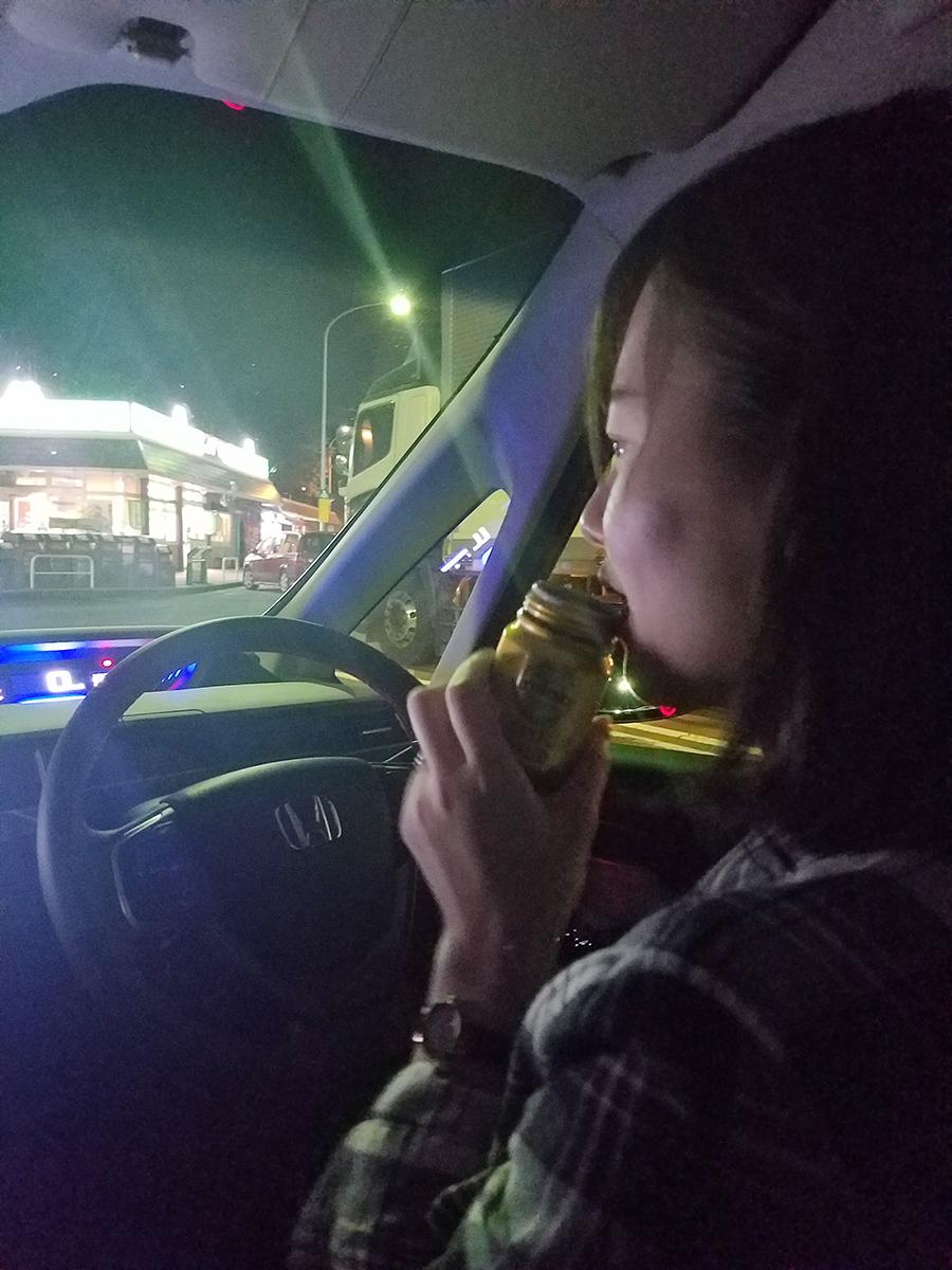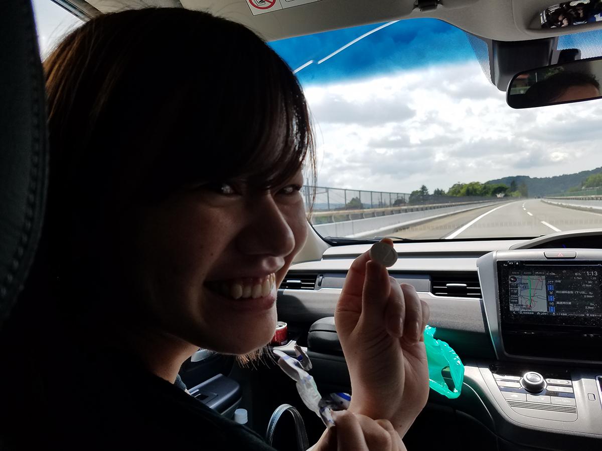道中、一時運転をお休み。助手席では、お菓子にニコちゃんマークがある!と一人ではしゃいでいました。