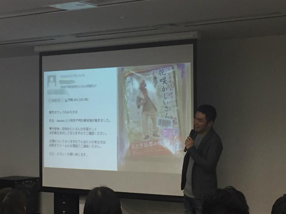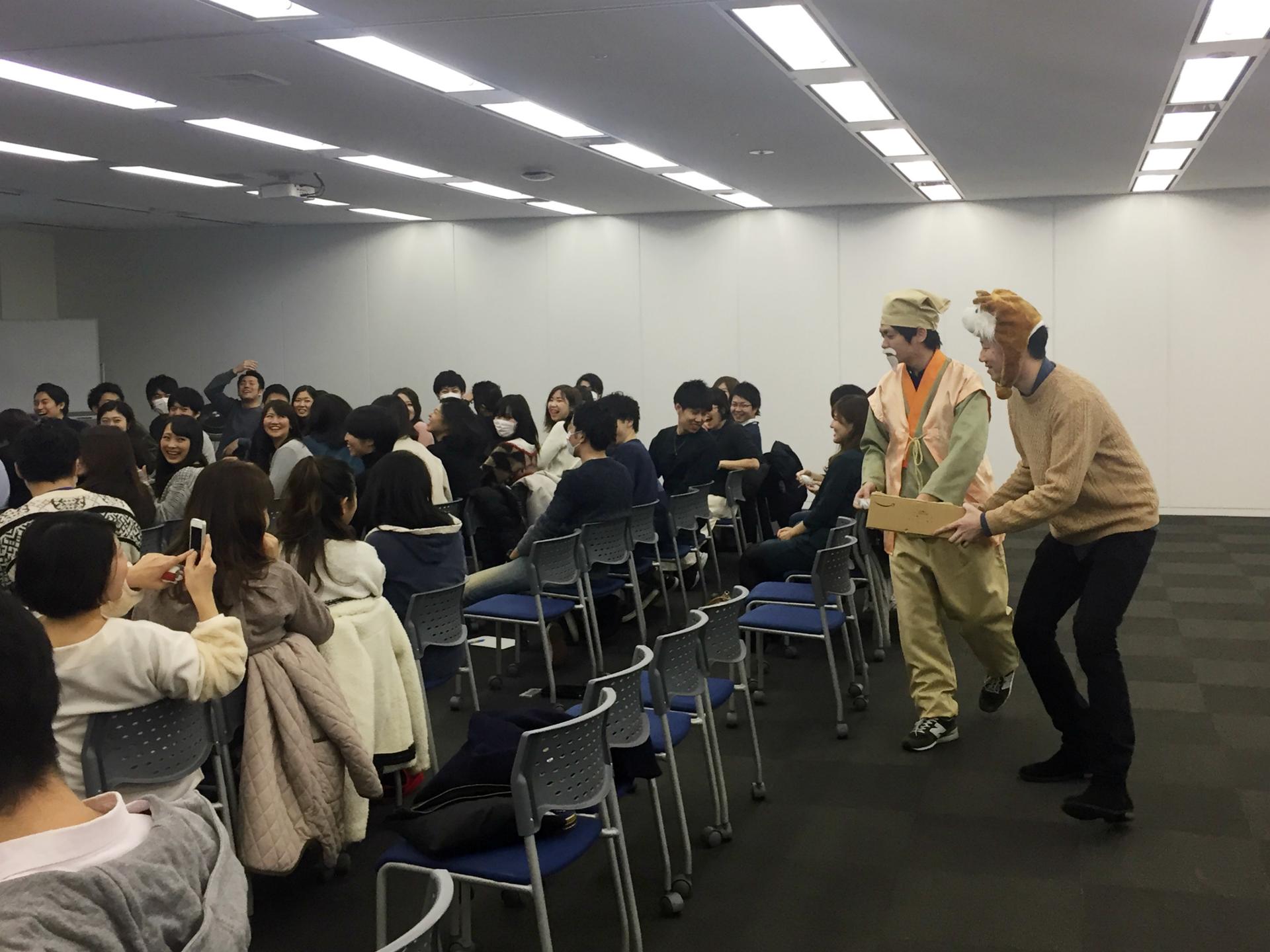 豆大福を配りながらの登場シーン。注目していただきたいのは、手に持つ箱。全東京を震わせたamazonの箱を使うサービス精神に感動。