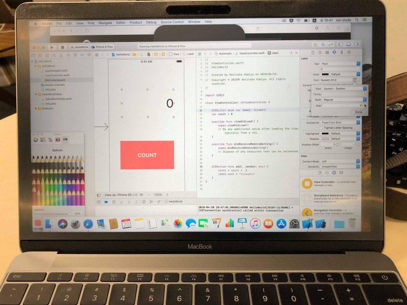 Xcode(iOSアプリ作成のためのあらゆる機能が備わったツール)を立ち上げて、せんせいが用意してくれたZipファイルを開き、Swiftを数行書いてみたら、