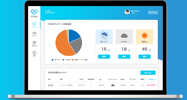 サービスの流れとしては、入社後1年の間、月1回、チャット形式のアンケートに回答を社員に送信。その結果を「晴れマーク」「曇りマーク」「雨マーク」で表示されます。