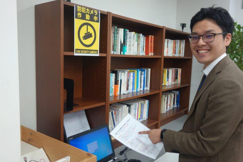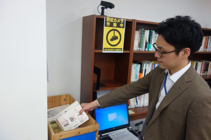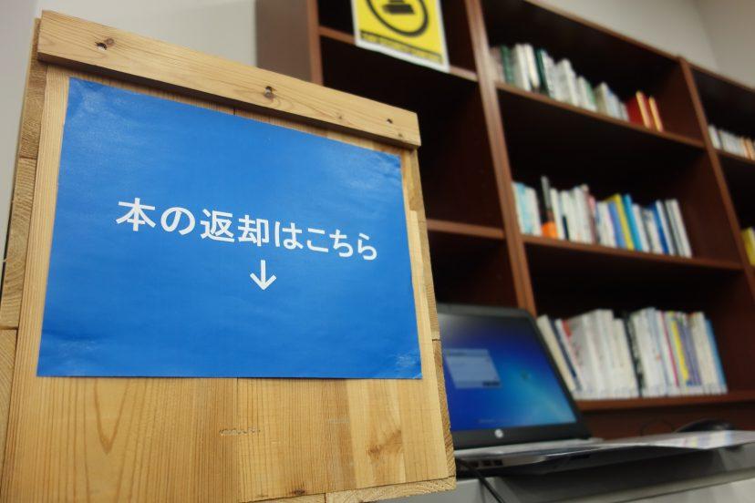 なるほど。茶色の本棚前に、PCと借り方マニュアルが置いてあるんですね。