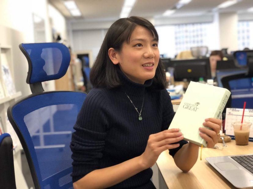 - 東京オフィス20階に誕生した、社員向け図書館「デジブック」の図書委員。クリエイターやエンジニア向けの書籍ラインナップが充実しています。
