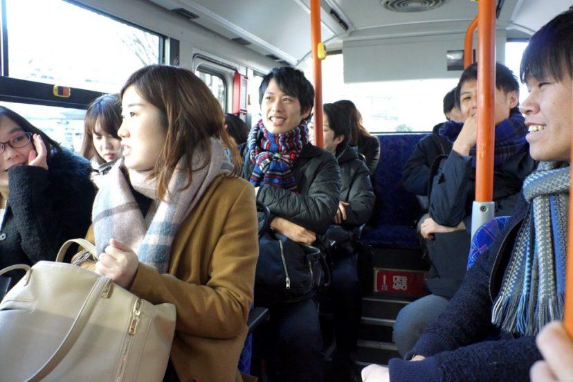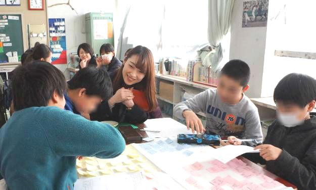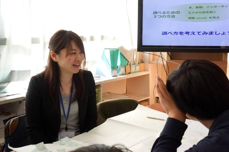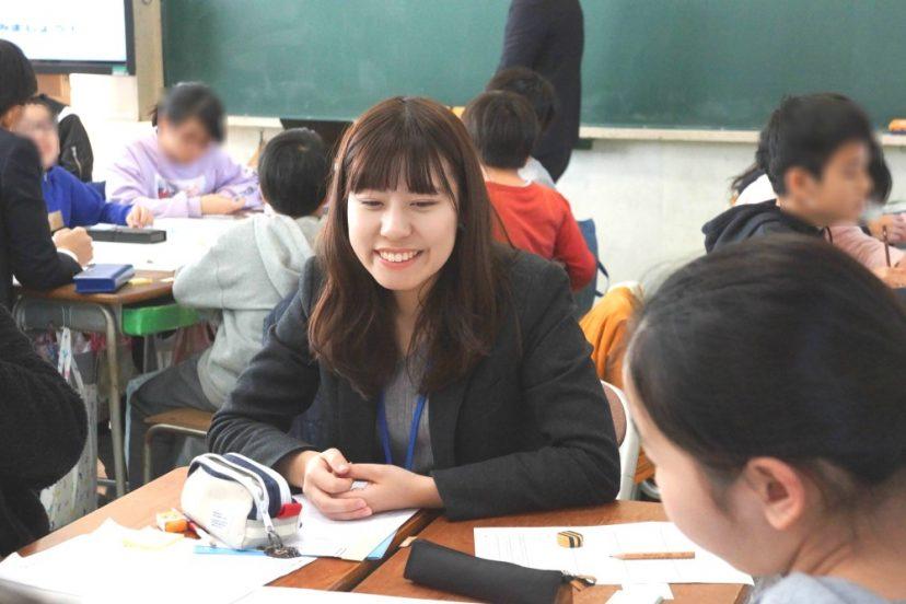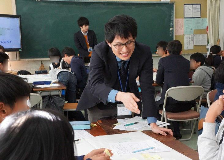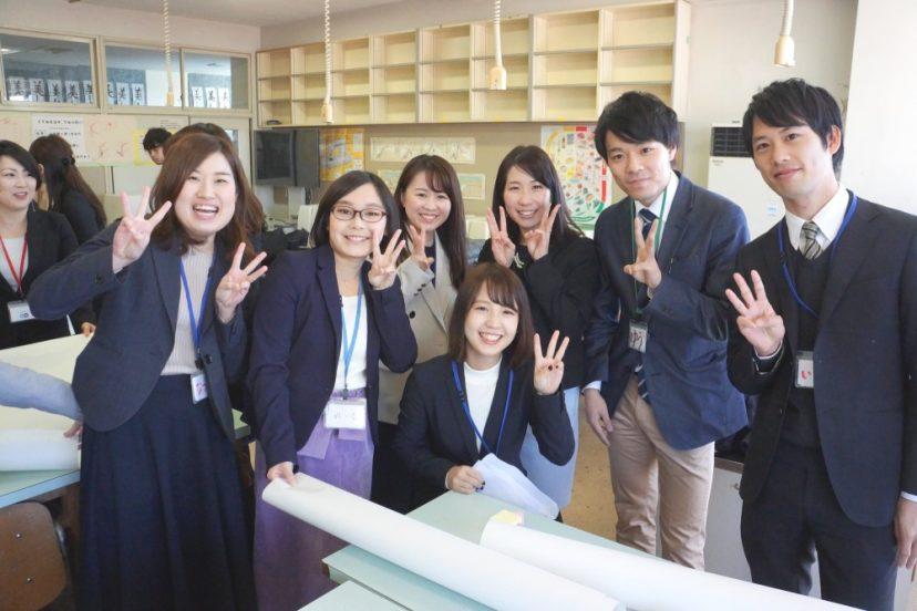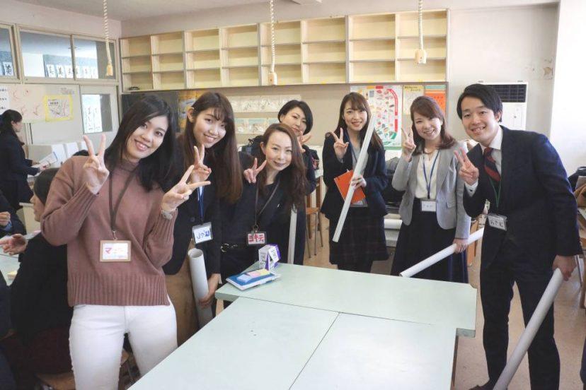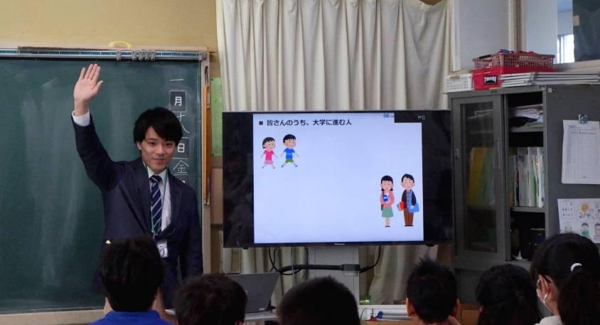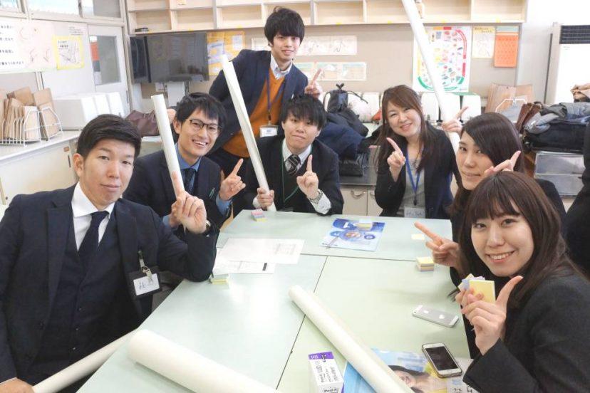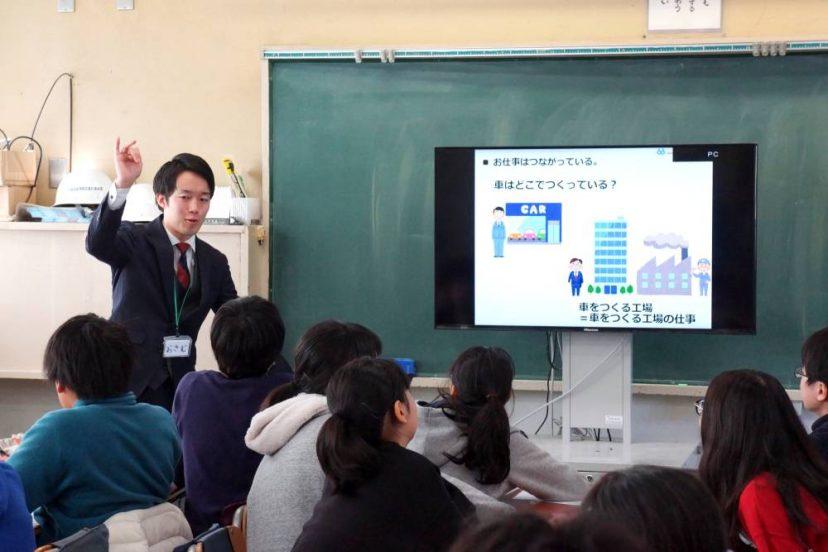 新卒12年目、さすがの貫禄の福島先生。大学生のお仕事探しについて、興味津々の生徒たち。