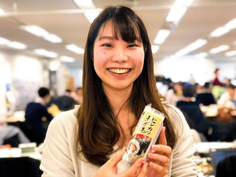 新妻りこちゃんは、ヒレカツ恵方巻きを手に入れて嬉しそうです。