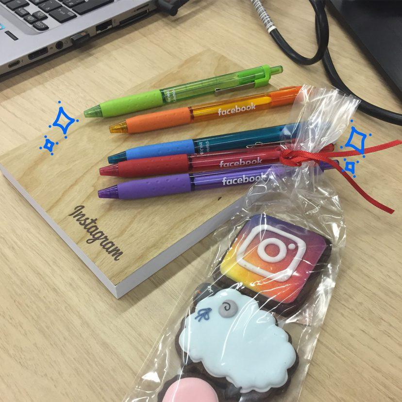 カオリさんの席におじゃましたら、カラフルなペンやクッキーが置かれていました。