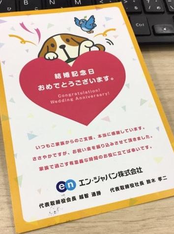このハガキは結婚1年以上経過している社員全員に、会社から送られます。(しかも到着は結婚記念日にちゃんと届くんです。これでつい記念日を忘れがちな社員も安心!)
