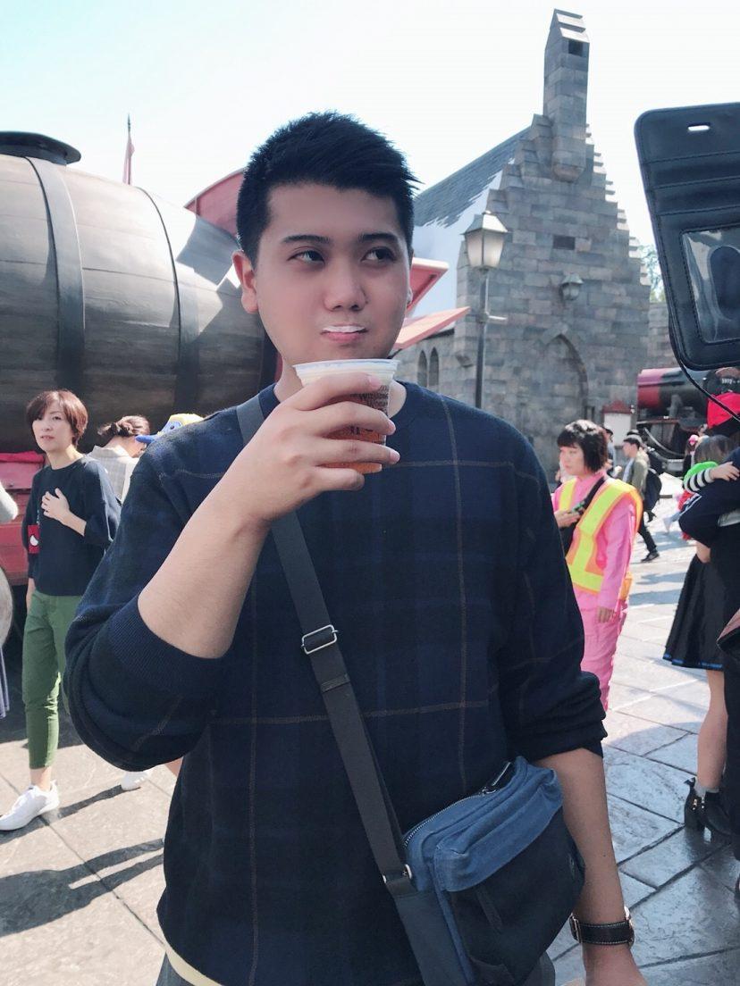 『ビールを飲みながら、泡でヒゲができているか確認する藤原です。』