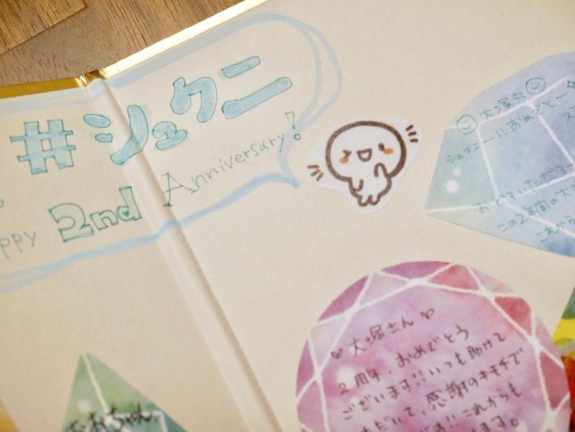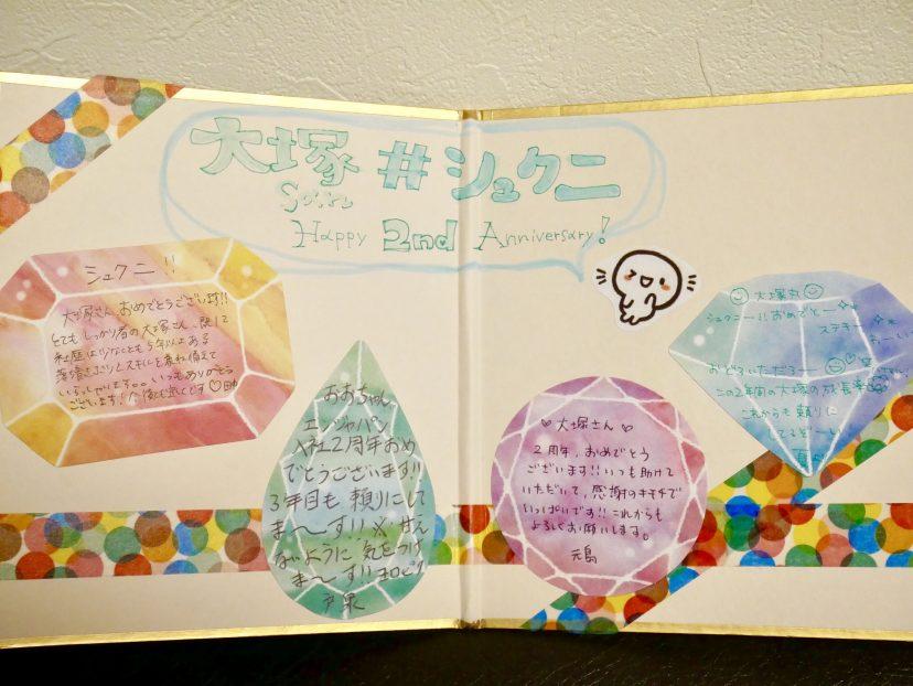 そんな入社2周年、略して「シュクニ」を記念して、事務局の方々から花束とメッセージをいただきました。