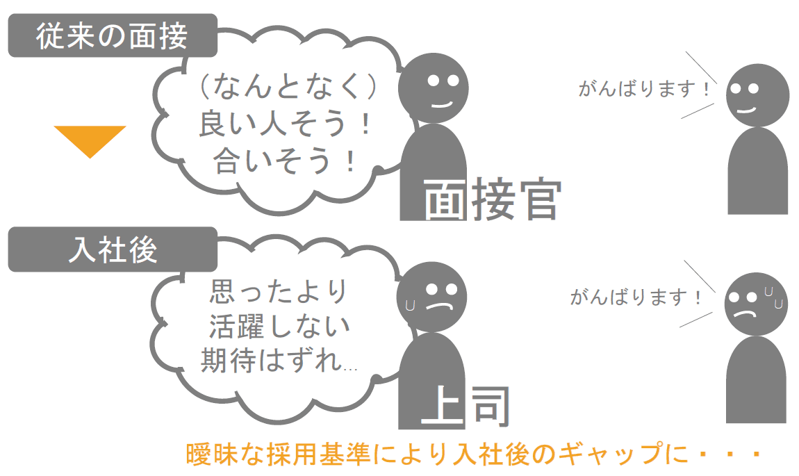 これまでの面接って、面接官の経験による勘に頼っていたんだ。曖昧な採用基準が入社後のギャップにつながることもしばしば…