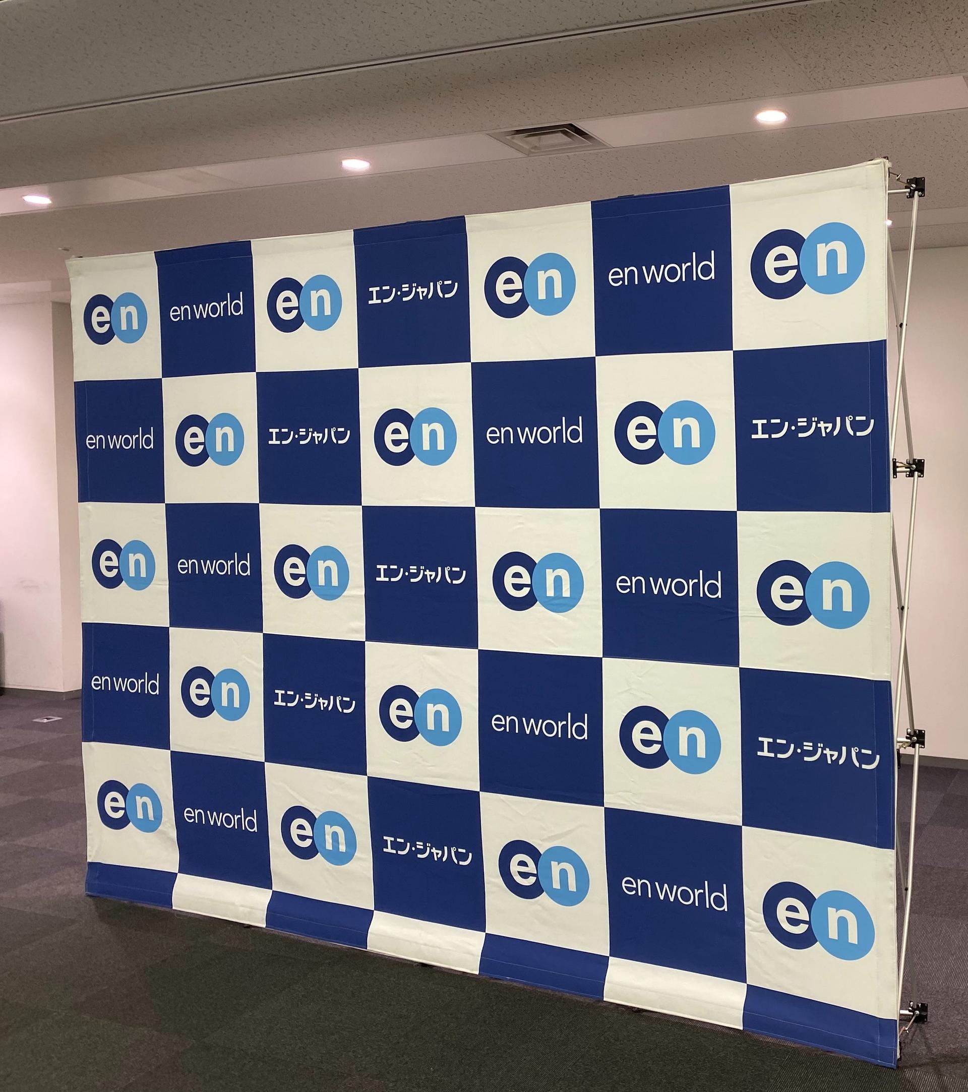記者会見はエン・ジャパンのセミナールームで開催。社員で設営や準備をしました!
