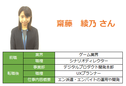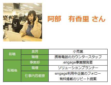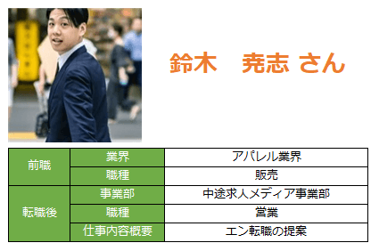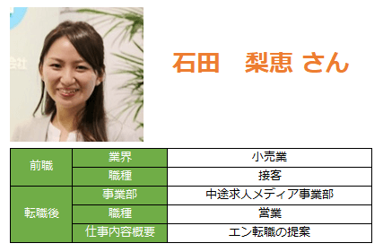 前職で新卒入社の社員が1年以内に7名全員辞めたということがあり、企業側も新卒側もミスマッチがないようにするために自分にできることがないか、と思って転職しようと思いました。その気持ちから、エン・ジャパンの「入社後の活躍・定着」に共感し、この会社に入りたいと思いました。