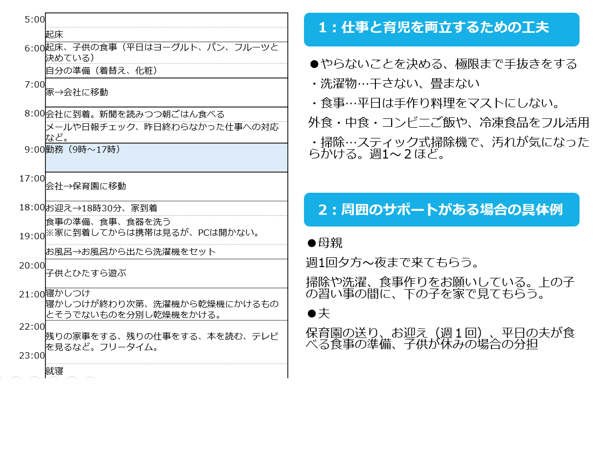 セミナーでは、復職後の1日のスケジュールを考えたり、すでに復職しているママ社員から時短のコツをレクチャー。