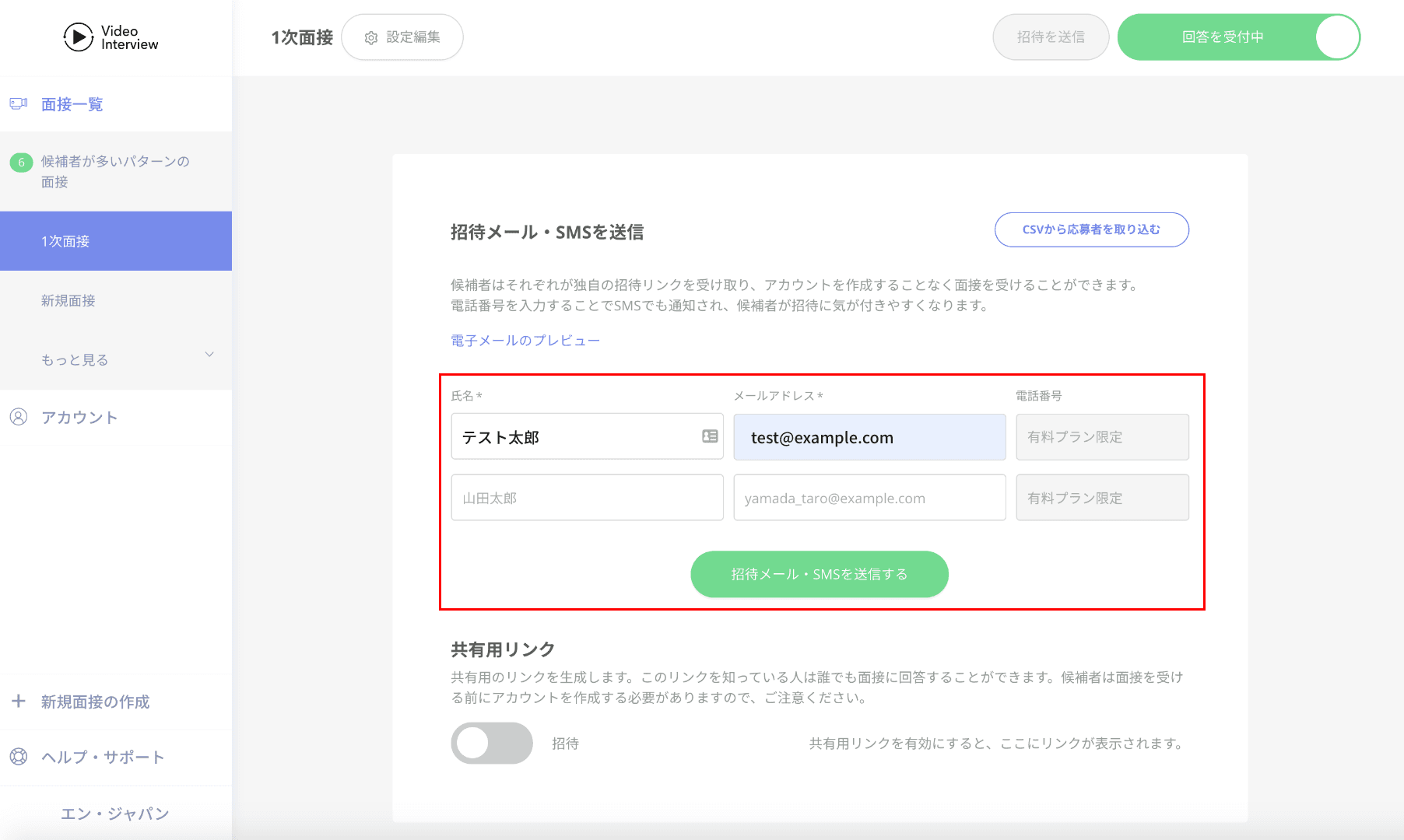 作成した面接に、候補者を招待します。右上の「招待を送信」ボタンをクリック