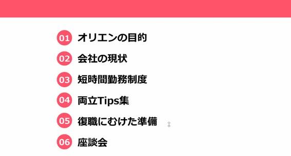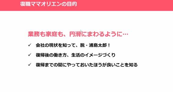 産休育休から復帰するママ社員向けに「復帰前ママ向けオリエンテーション」を開催しました。