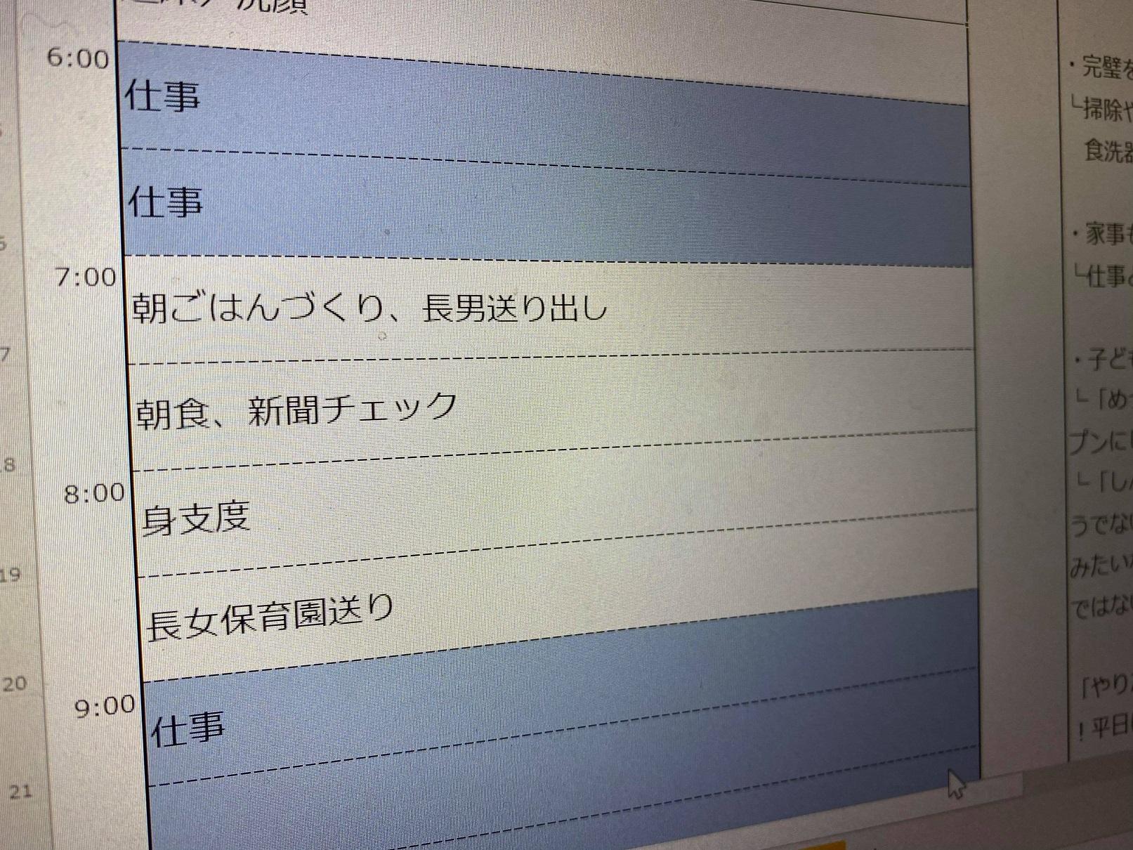 子供と一緒に10時に寝て5時に起床、子供が起きるまで仕事をすることも。
