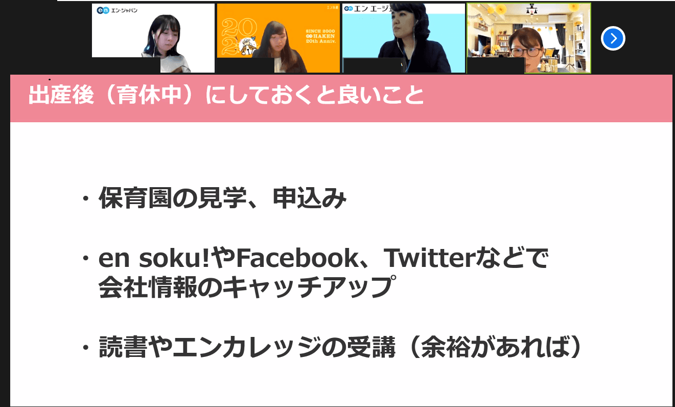 今までのママ社員の復職ともちょっと違う今年度。不安とワクワクが入り混じっているようでした。WOMenLABOでは、在宅勤務での復職も継続してサポートします!