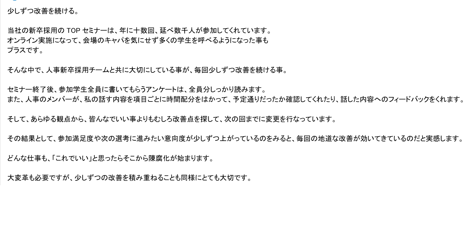 社会人と学生の立場なので、どうしても「教えてあげる、導いてあげる」スタンスになりがちなんですが、その学生さんにはその学生さんの道があって、正解は本人が決めるもの。