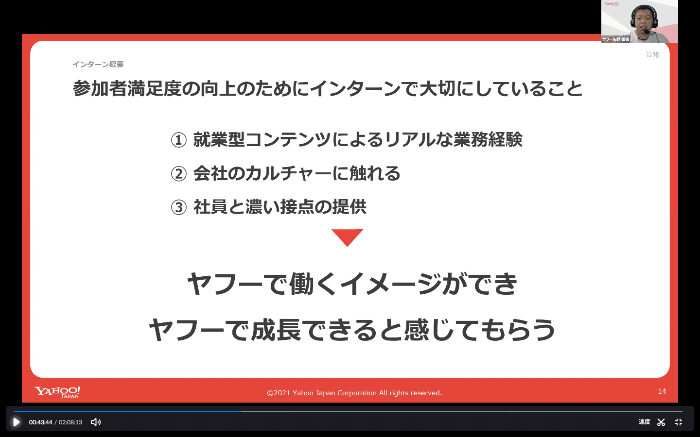 ・現場社員の巻き込み方や学生とのコミュニケーションなど勉強になることが多く、参考になりました。一つひとつの質問に丁寧に回答いただき、Yahooさんの内側のリアルを知ることができとても良い時間となりました。ありがとうございました!!