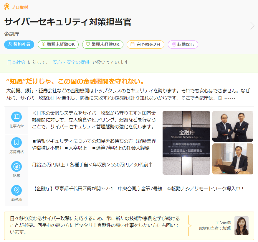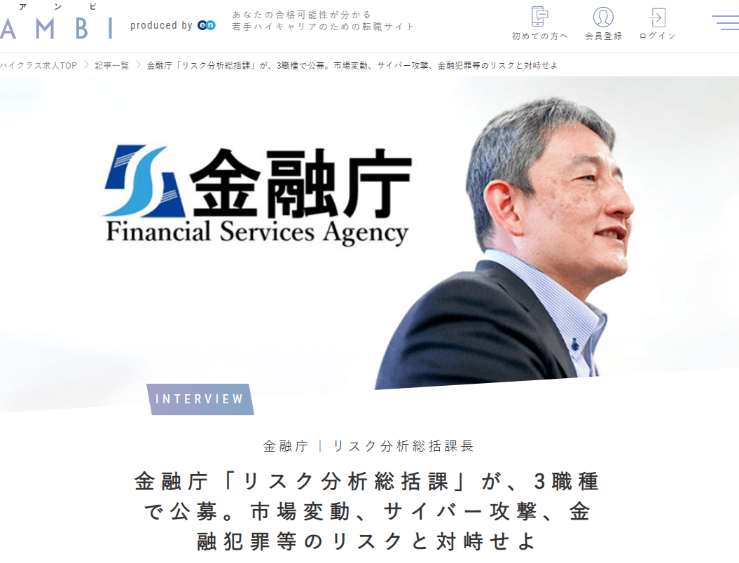 某ドラマがきっかけで話題になった、金融庁の担当官(検査官)。金融機関の健全性を検査・指導する仕事ですが、今回は特に専門的な「マネーロンダリング・テロ供与対策」「サイバーセキュリティ」「市場リスク」という3つの敵と戦う担当官の募集でした。