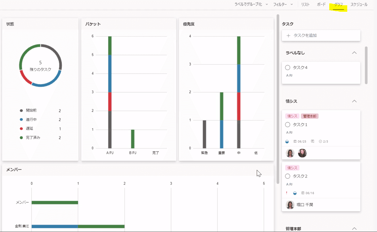 ・誰にタスクが偏ってるか、プロジェクトが予定通りいっているかを、グラフやチャートで一目でわかる