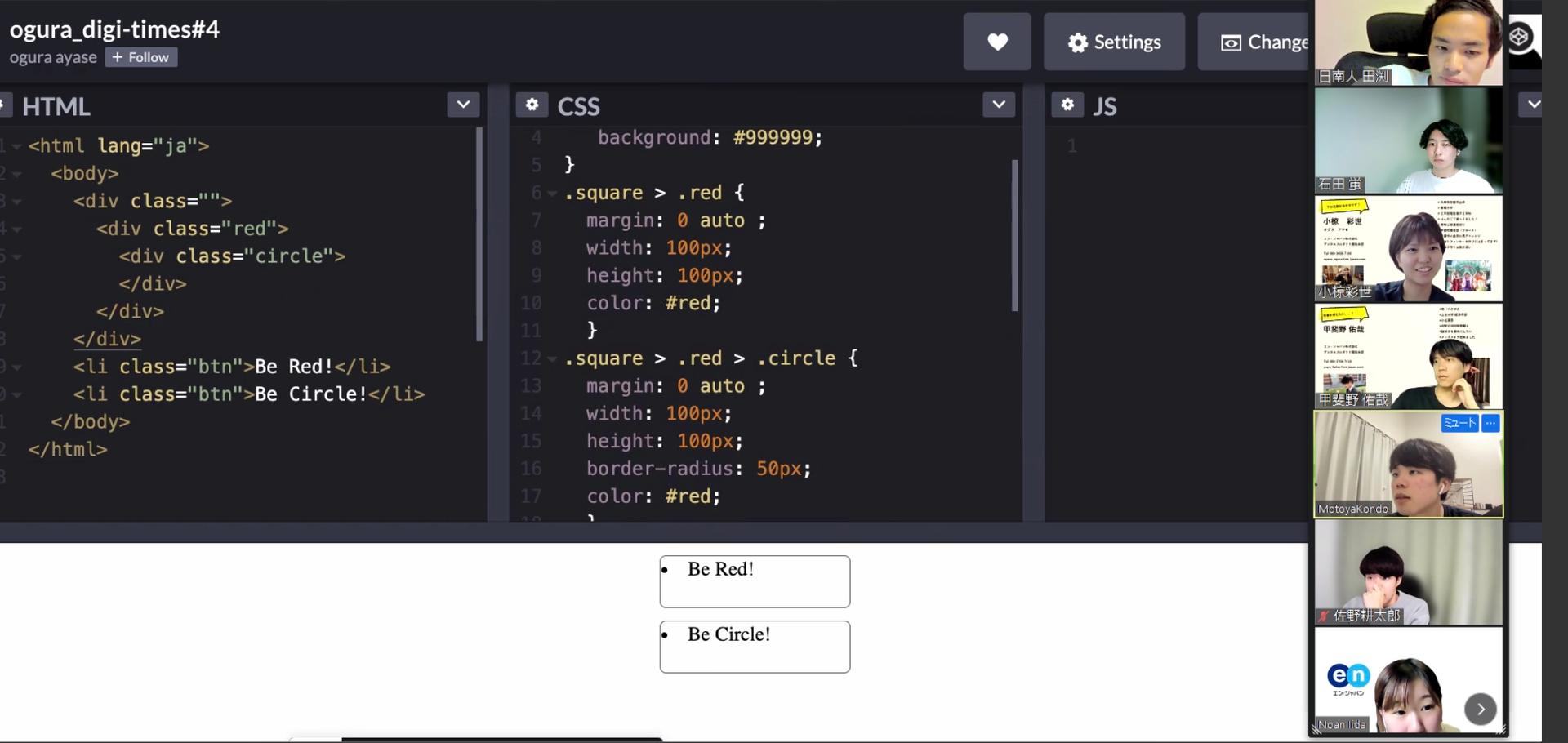 digi-timesでは、講座ではなく実際にプログラミングを書いてもらう実践形式です。どう書けばページ上に反映されるのか、課題を解く中で出てくる不明点は、とても手触り感を持ったリアルなもの。