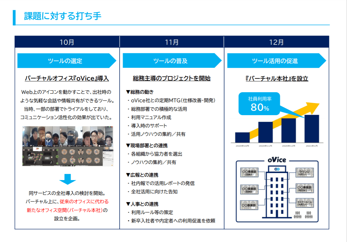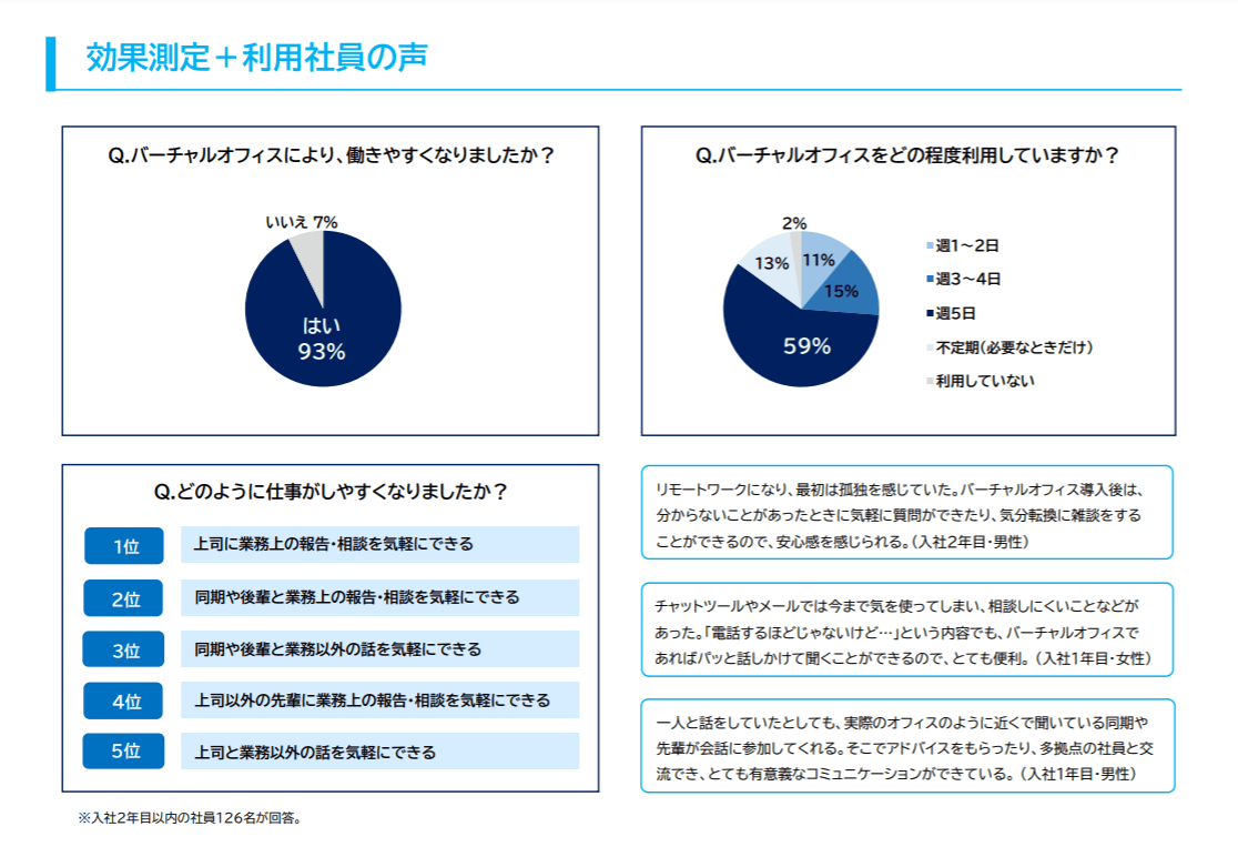結果、いまでは「バーチャル本社」まで設立。エン・ジャパンの第2のオフィスとして、コミュニケーションはもちろん、新人育成や社内イベントの開催など、活用シーンが拡がっています。