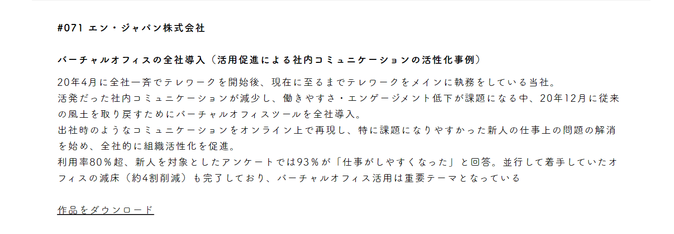 今回、エン・ジャパンは「バーチャルオフィスの活用」をテーマにエントリーしています。