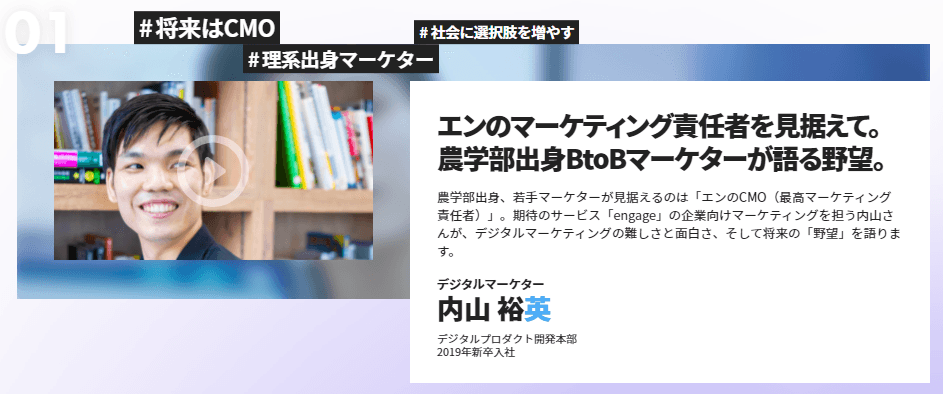 デジタルマーケター・データアナリストなど、学生さんからはイメージしづらいエンの様々な職種を紹介しています。