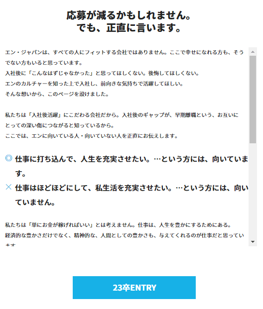 これも入社後のミスマッチを防ぐために、「正直・詳細に伝える」というエンのスタンスがあるから。