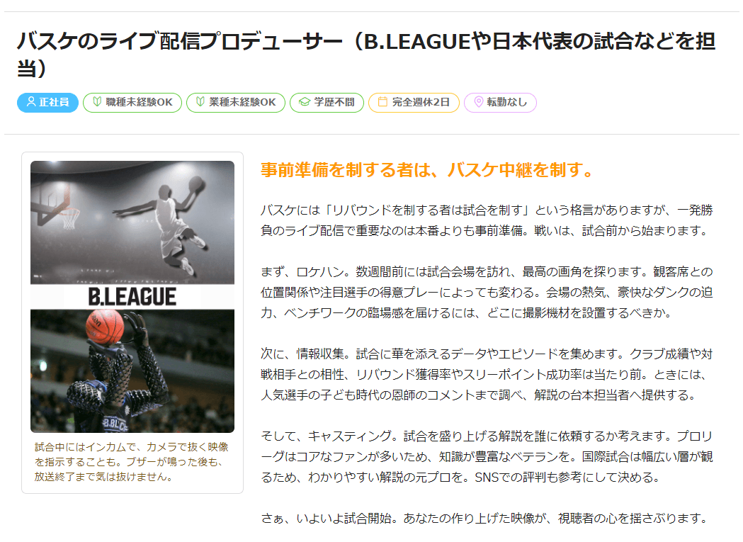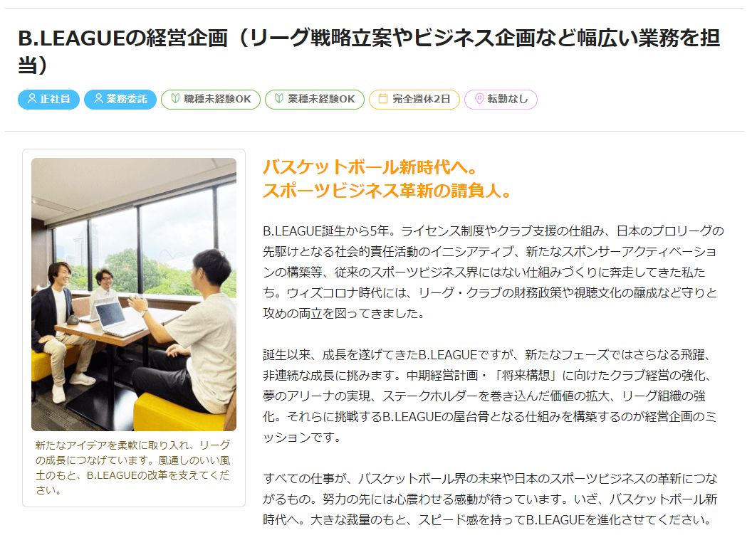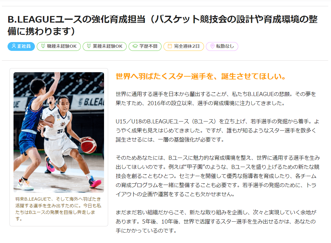 さまざまなポジションからスポーツビジネスに携われる募集となっています。