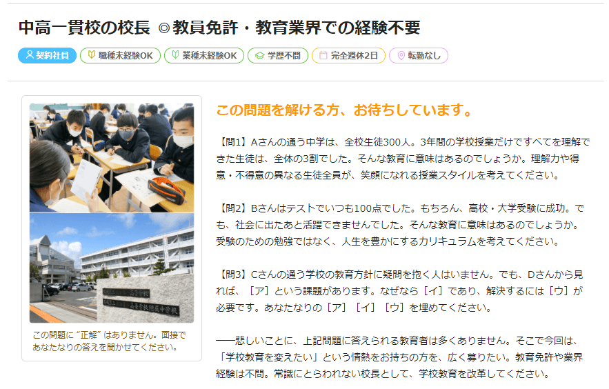 そんな学校教育の改革に一緒に取り組んでくださる方を採用すべく、『エン転職』『ミドルの転職』での公募を実施。