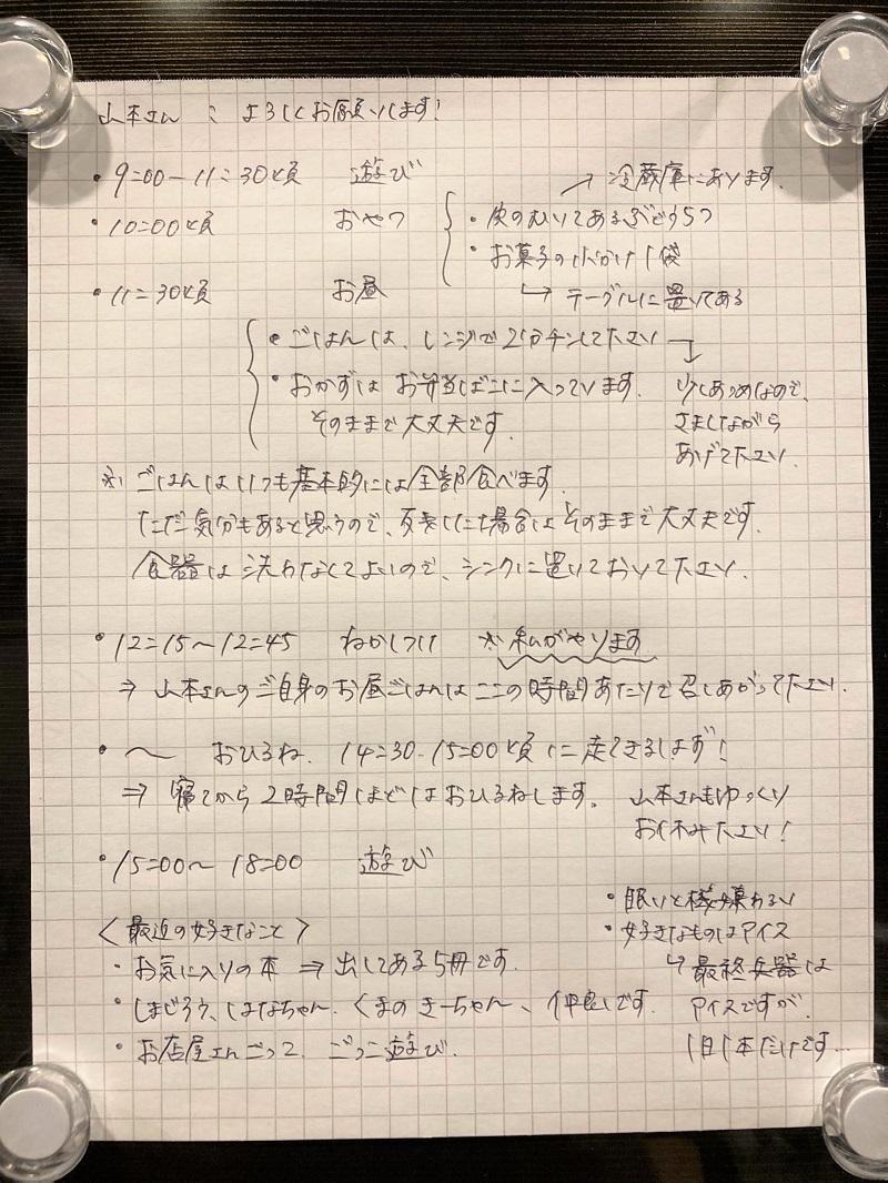 └最近流行っている遊びや好きな本、どんな時に機嫌が悪くなるか、良くする方法などを記載シッターさんへの申し送りをメモにして渡すことで相手がメモを取る時間を削減。伝えたことの認識のズレや忘れてしまったということがないのでエビデンスにも。