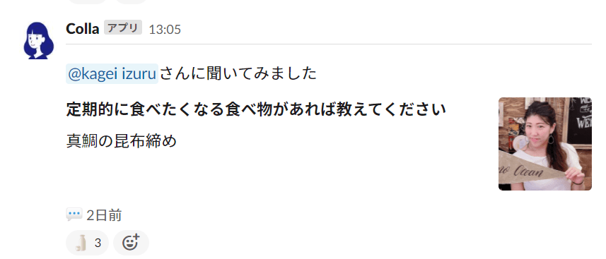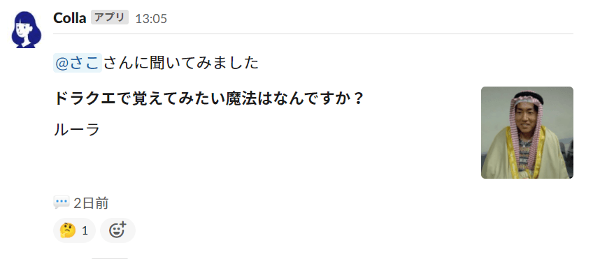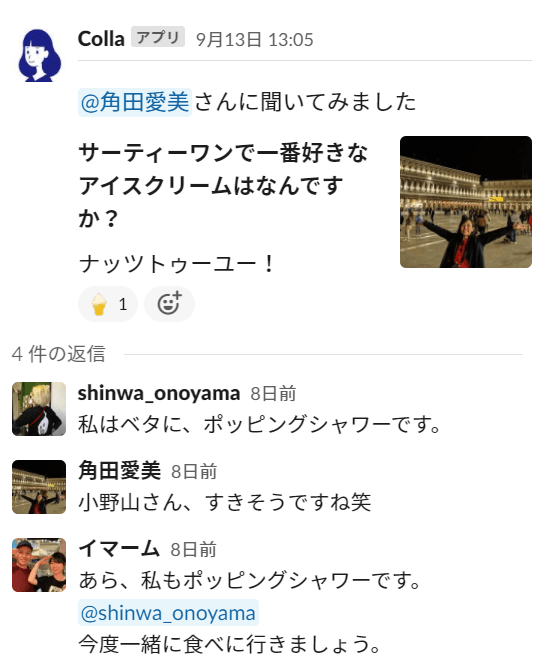 アプリキャラのCollaさんがメンバーに個別で質問し、その結果を1日に1回紹介してくれます。(紹介されるのは1日に複数名分)